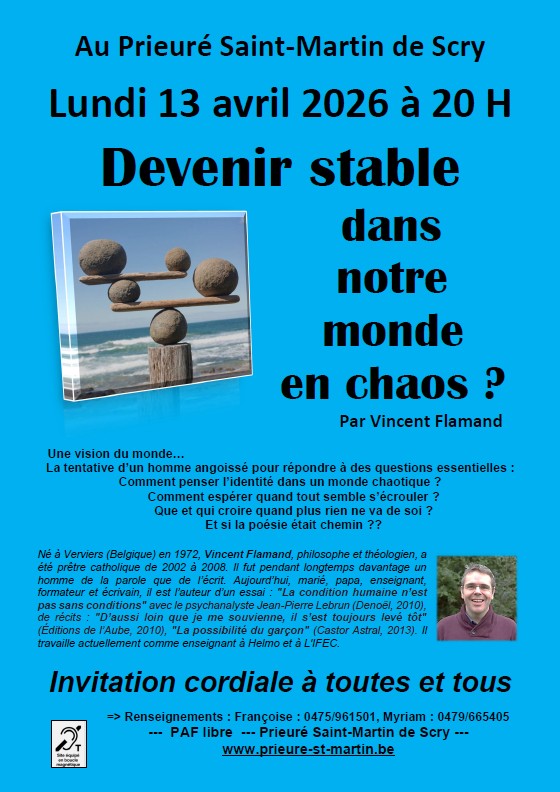 - Le lundi 13 avril de 20 h. à 22 h. : « Devenir stable dans un monde en chaos ? » par Vincent Flamand